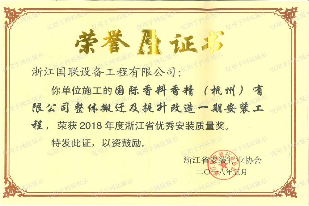 国际香料香精改造一期安装质量奖2018.5